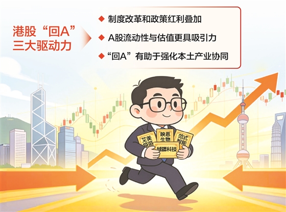 除了政策和制度红利,排排网财富研究总监刘有华告诉证券时报记者,本轮港股“回A”热潮兴起还有两个重要驱动力:一是A股流动性与估值更具吸引力,对硬科技、生物医药等赛道溢价明显,本土投资者认知度更高,融资效率更优;二是“回A”有助于强化本土产业协同,方便企业对接内地供应链、市场与政策资源,提升品牌影响力。“‘港股上市、A股放大’正成为越来越顺畅的资本路径。”刘有华表示。