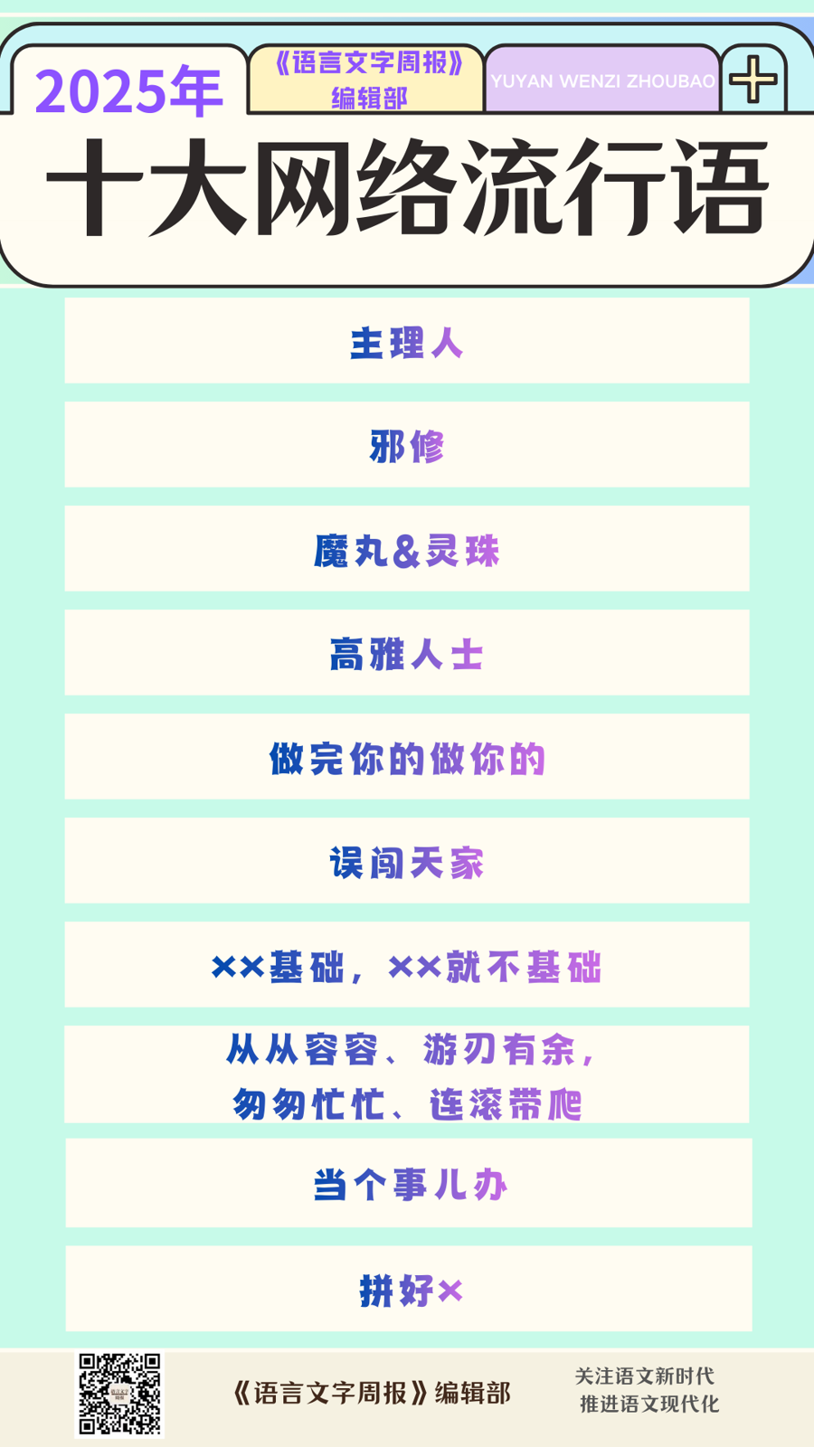上榜前者“十大网络流行语”的有:主理人、邪修、魔丸&灵珠、高雅人士、做完你的做你的、误闯天家、××基础,××就不基础、从从容容、游刃有余,匆匆忙忙、连滚带爬、当个事儿办、拼好×。
